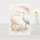 A serene and refined birthday design featuring a graceful white crane standing amid soft blush peonies and airy greenery. Delicate watercolor textures, muted pastels, and subtle gold accents create a calm, elegant atmosphere. The flowing “Happy Birthday” script complements the composition, making this artwork ideal for sophisticated tastes, nature lovers, or anyone who appreciates timeless beauty and quiet charm.