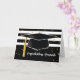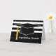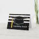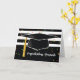 Comemore com o novo formando com esta placa listrada em preto e branco. Um grande boné de formatura preto está no centro com uma torneira de ouro amarelada. Confetti está caindo. Placa de excelente para desejar aos parabéns do formando. Perfeito para cara ou menina.