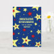 Parabéns no cartão de graduação para sobrinho com estrelas coloridas azuis, vermelhas e amarelas e verso sentimental.