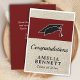 Cartão de Graduação de Chapéu Formando Rustic Red Parabéns com um Nome de Formando. Cartão de graduação com boné de formatura, Parabéns de texto, um nome do formando, Classe de no lado frontal - personalize com seu texto. O texto está sobre um fundo robusto. Adicione seu texto no verso.