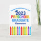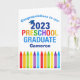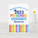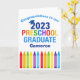 Este adorável cartão de graduação pré-escolar de 2023 apresenta um boné legal acima do escrevendo colorido e uma fileira de lápis no arco-íris. Os parabéns de formando de pré-escola bonitos são feitos em cores divertidas pelo último dia da escola primária com o nome do seu filho personalizado em azul. Parabéns ao nosso formando pré-K!