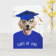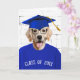 Cachorro golden retriever com uma camiseta azul e gorro de graduação usando óculos de aro preto sobre fundo de parede de tijolos de graduação parabéns. O texto é editável.