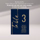 Gráfico de Nomes de Números de Tabela Dourados do Marinho de Script. Edite o número de cada mesa e adicione-o separadamente ao carrinho. O mesmo design está em ambos os lados, use para um monitor suspenso para que os convidados possam encontrar seu assento ou em cada mesa. Em azul clássico de marinho com escrevendo de ouro. Personalize facilmente o número da tabela e seus nomes de convidado. O mesmo design está em ambos os lados e será atualizado simultaneamente à medida que você muda as palavras para as suas.