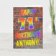 A frente desta vibrante, divertida e excitante design de cartões de saudação com tema de aniversário mostra a mensagem "HAPPY 71RUA BIRTHDAY" com letras que têm um arco-íris multicolorido como um padrão de gradiente, e um nome personalizado amarelo, num fundo de padrão de parede de tijolos. O olhar é inspirado pelo do grafite ou arte de rua desenhada na parede. O dentro apresenta uma mensagem de saudação de aniversário que pode ser personalizada. Um cartão de saudação de aniversário divertido, feliz e personalizado como este pode ser uma forma especial de comemorar o aniversário de 71ruas de alguém. [~Z0000357]