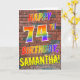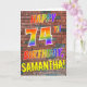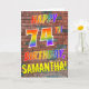 A frente desta vibrante, atraente e divertida design de cartões de saudação com tema de aniversário apresenta a mensagem "HAPPY 74TH BIRTHDAY" com letras que têm um arco-íris multicolorido como um padrão de gradiente, e um nome personalizado amarelo, num padrão de padrão de parede de tijolos. O olhar é inspirado pelo do grafite ou arte de rua desenhada em uma parede. O dentro apresenta uma mensagem de saudação de aniversário que pode ser personalizada. Um cartão de saudação de aniversário divertido, feliz e personalizado como este pode ser dado para comemorar o 74.º aniversário de alguém. [~Z0000357]