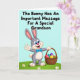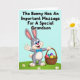 This card shows a friendly bunny 🐰 centered on a soft background that fades from sky blue at the top into grassy green below. The bunny has gentle gray fur, pink-lined ears, and bright blue eyes, and its wide smile feels like it’s meant for someone it cares about. A neat blue bow tie adds a sweet, dressed-up touch, like it’s arriving for a special visit. One paw is lifted in a welcoming wave, while the other holds a woven basket filled with shiny egg shapes in pink, teal, purple, yellow, and orange. Along the bottom edge, small white daisies with sunny yellow centers sprinkle the scene like a spring border 🌷. Across the upper area, black sans-serif text reads, “The Bunny Has An Important Message For A Special Grandson,” standing out clearly against the pale sky. The shading stays smooth and softly blended, with the daisies clustered most densely near the lower corners.