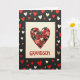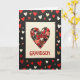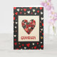 This greeting card features a cream square card set against a deep matte black background. Near the top, a large heart is formed from many tiny heart shapes layered together. The small hearts come in reds, pinks, black, and a few touches of gold and silver, with some glittery pieces and others showing patterns like gold dashes on black or a red-and-gold plaid. Below the heart, the text “GRANDSON” appears in raised red letters across the lower part of the cream card, making it clear who it’s for. Around the cream card on the black background, extra hearts are scattered in different sizes and colors like red, white, gold, and light brown. The mix of textures and thoughtful details makes it feel like a caring way to show affection, whether it’s from a grandparent or someone who wants to remind him he’s loved 🥰. It’s a simple, sweet design that says a lot without needing many words ❤️, and it’s a friendly way to share Valentine’s Day sentiments.