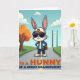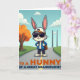 This greeting card shows a stylish grey bunny 🐇 standing in the middle of a gently curving road, giving a friendly, confident look that feels like it’s meant for someone special. The bunny has long ears with pink inner details, a white-and-orange cap worn backward, dark sunglasses, a blue jacket, and a brown messenger bag resting at its side. The setting sits under a bright blue sky with soft white clouds, and the even daylight makes the scene feel open and welcoming. On the left side, a tree with warm orange leaves adds a cozy contrast, like a quiet walk you’d share together 🌷. The road has a strong yellow center line that leads your eye toward the distance, adding a sense of heading somewhere side by side. Along the bottom, the message “TO A HUNNY OF A GREAT GRANDBUNNY” appears in large, decorative lettering, set neatly beneath the illustration in a dark, easy-to-see color. Far back on the horizon, two slender pillars rise against the pale background beyond the receding road.