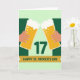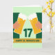 Designed with two stylized hands in warm, muted tones, the card shows them lifting tall mugs of golden ale toward each other in a close toast that feels like an easy moment between friends. Each mug is filled with pale gold beer, dotted with small bubbles, and topped with thick white foam, with a few extra fizz marks floating near the rims. In the middle, a dark green “17” sits prominently between the glasses, drawing your eye to the center as the mugs angle inward. A wide golden banner stretches across the lower area, carrying the words “HAPPY ST. PATRICK’S DAY” in deep green letters. Behind everything, the background shifts between light mint green and a deeper forest green, creating simple contrast without extra clutter. The tight spacing of the clinking mugs adds a hint of warmth and closeness, like a shared laugh over a first sip ☘️. Small green accents and the rich gold tones keep the scene festive, with a little extra luck in the air 💚. The foam crowns are bright white against the greens, and the banner’s gold sits neatly along the bottom edge beneath the centered “17.”