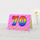 Este feliz e divertido cartão de cumprimentos de 70 de aniversário tem uma frente com um grande número de "70" tendo um padrão de gradação colorida inspirado no espectro do arco-íris, em um alegre rosa escuro e rosas claro em forma de coração padrão de listras. A frente também apresenta a mensagem "Happy 70 Birthday", seguida de um nome de destinatário editável. O dentro apresenta uma mensagem de saudação de aniversário personalizada, ou talvez possa ser apagado e deixado vazio se uma mensagem for escrita manualmente. Um cartão de aniversário personalizado como este pode ser uma forma divertida e feliz de enviar uma mensagem em comemoração do setuagésimo aniversário de alguém. [~Z0000418]