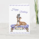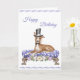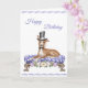 Cachorro giro bonito em um sofá roxo com um chapéu e um monóculo. Cartão de aniversário bonito e engraçado