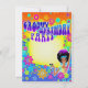 Divertido e colorido convite à apresentação de pérolas de 5" x 7" com o texto, "Festa de aniversário de Groovy" impresso no estilo divertido 60s em um fundo laranja, amarelo, verde e azul com uma variedade de imagens florais de 70s. O canto inferior direito apresenta uma mulher com brincos grandes afro e balançando um copo de martini. O verso é o mesmo, mas sem texto. Personalize com os detalhes do seu partido. Consulte o convite e a etiqueta de quebra-cabeça correspondente. Consulte toda a coleção de convites do Disco 70s nos CONVITES | Seção Convites e Cartões.