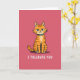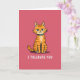 This funny greeting card features a orange tabby cat sitting front and center against a bright fuchsia pink background. The cat faces forward with narrowed aqua-blue eyes and slightly furrowed brows, giving it a grumpy, unimpressed look. Its fur is shaded in warm oranges with cooler blue accents, and the simple outlines keep the illustration easy to read at a glance. Around its neck is a teal collar that stands out sharply against the cat’s coat. Near the bottom of the card, white block letters in a sans-serif style read “I TOLERATE YOU,” making the message feel dry and funny. The overall scene is minimal, but it still lands as a sweet, teasing way to show affection—perfect for a friend or partner who enjoys a little sarcasm ❤️❤️