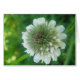 Eine grosse einzelne weisse Kleeblüte vor grünem wiesenhintergrund ist auf dieser Grusskarte. Morre Karte ist blanko.
