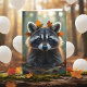 Feliz aniversário para você! Um cartão de aniversário bonito para ele ou para ela com um guaxinim adorável com folhas de outono à sua volta.