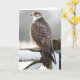 Um falcão em uma porta na neve. Uma imagem torrada e afiada.