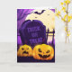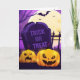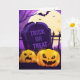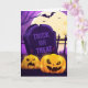 O cartão de saudação é mostrado com um festivo impressão de abóboras assustadoras do Halloween. Personalize este cartão ou comprar como está. Imagens de Ações vecteezy.com