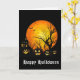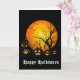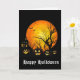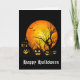 Cartão de saudação é mostrado com um impressão de cena de Dia das Bruxas assustador. Personalize este cartão ou comprar como está.