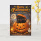 A ilustração apresenta um adorável gatinho preto saindo de uma lanterna de abóbora brilhante, acenando com uma pata minúscula sob uma lua cheia, ambientada em uma cena mágica de outono, com fantasminhas amigáveis tremeluzindo velas e morcegos voando. É a maneira perfeita de desejar aos amigos e familiares um feriado fantástico com seu brilho caloroso de livro de histórias e cores vibrantes. Este cartão é um tesouro digno de guardar que captura todo o charme e o encanto da noite de Halloween.