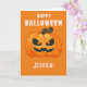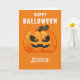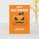 Cartão cor de laranja retrorreflector da Pumpkin do Halloween. Aranha retrógrada bonita e dentro fantasma. Dentro personalizável. Por favor, verifique nossa gama de cartas divertidas, coloridas e interessantes em uma variedade de temas!