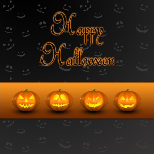 Feliz ilustração do Dia das Bruxas com 4 abóboras de jack-o-lanterna diferentes, com uma borda laranja sobre um padrão preto de Halloween.