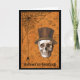 Cartão de Halloween com crânio vestindo um chapéu superior, teia-aranha e texto antigo em segundo plano