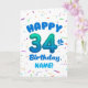 Celebrate their 34th birthday with a bright, cheerful, and personalizable birthday card! This custom name birthday card features a bold number thirty four balloon and colorful confetti.