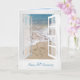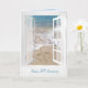 50th wedding anniversary with names of couple in beach hearts and sand with frothy ocean surf and open window view.