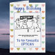Cartoon óptico. O Cliente à Optician um registro chamado Olhos Espanhóis Azuis. Personalize com seus próprios detalhes e mensagem