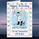 Cartoon óptico. Optician está lendo o pequeno impressão em uma parede de teste de olhos. Fundo de corações.Personalize com seus próprios detalhes e mensagem. Cartão de aniversário para um óptico.