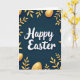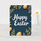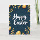 Designed with a deep teal-blue background that fades softly through a gentle gradient, this card sets a cozy springtime scene 🌷. Centered on the front, the words “Happy Easter” appear in large white lettering with smooth curves and a faint shadow that helps them stand out. The message sits right in the middle, inviting the eye the way a warm note between close friends might, calm and reassuring. Around the edges, a symmetrical frame of golden leafy stems curls inward, like two sides leaning toward each other in a quiet, affectionate gesture. Tucked among the foliage are several golden egg shapes, each decorated with thin white line patterns that feel like careful little details shared between loved ones 🐰. The gold elements shift from lighter to deeper tones, giving them a metallic look against the dark background. The border forms a balanced wreath effect, with the brightest gold highlights catching along the leaf tips and the patterned eggs near the corners.