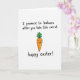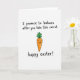 This card shows an anthropomorphic orange root vegetable centered on a bright white background, drawn with simple lines and a friendly, flirty charm 🐰. The vegetable’s tapered body is a rich orange with a tuft of jagged green leaves at the top, like a little hairstyle. Two tiny black dot eyes sit near the upper middle, with one eye winking as if sharing an inside joke with someone close by. A wide curved smile stretches beneath, giving the character a teasing, affectionate look that reads like gentle friendship or a light romance. Thin vertical black strokes run down the body to suggest natural texture without adding clutter. Across the top, a black, childlike handwritten line reads, “I promise to behave after you take this carrot,” spaced to frame the character without touching it. Near the bottom, “happy easter!” appears in matching black lettering, set lower and centered, leaving a neat margin of white space around the orange figure and its leafy green crown 🌷.