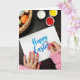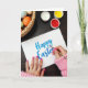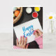 This design shows a top-down view of two hands with fuchsia-painted nails peeking from a soft pink knitted sleeve, carefully painting a flowing blue “Happy Easter” across a bright white sheet. A slim paintbrush hovers mid-stroke, and the steady spacing of the letters feels like a quiet note being made for someone special 🐰. In the upper left, a woven basket sits close by, filled with decorated eggs in pale green and light blue with speckles, plus one solid orange egg that stands out. Near the paper, three small white ceramic pots hold pools of paint in sunny yellow, deep red, and white, arranged like a tidy little studio setup. Everything rests on a dark wooden tabletop that adds warmth and contrast, like a cozy place two friends might share while making holiday cards 🌷. The lighting is soft and even, showing the knit texture of the sleeve, the basket’s weave, and the smooth grain of the wood. The “Happy Easter” text sits centered on the page in blue, with the brush angled slightly toward the last word as the final curve is being formed.