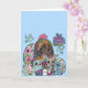A bright and whimsical Easter illustration featuring an adorable brown dog dressed in a colorful feathered chick costume, surrounded by cheerful spring friends. Sweet bunnies and wide-eyed blue birds gather among beautifully decorated Easter eggs filled with floral, polka dot, and patterned designs. Soft pastel colors pop against a light blue background, while playful birds flutter overhead and a “Happy Easter” sign adds a festive touch, creating a joyful springtime scene full of charm and celebration. All art is hand drawn and hand colored by Notta Bear Newfoundlands (www.nottabear.net)