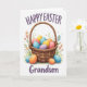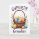 This design shows a warm brown woven basket centered on a white background, its textured weave drawn with cozy detail. The basket is filled with pastel eggs in sky blue, sunny yellow, gentle pink, soft lavender, and warm orange, with a few resting nearby as if they’ve just tumbled out. Around the base, slim green stems and small wildflowers frame the scene, adding soft peach, blue, and pink blossoms with a sweet, friendly feel 🌷. Near the top, the words “HAPPY EASTER” appear in deep purple lettering, curved in a gentle arc above the basket. At the bottom, “Grandson” is written in the same deep purple, placed neatly beneath the illustration like a tender note meant for someone close 🐰. The overall layout feels open and airy, with lots of white space that makes the colors stand out without crowding the message. Small leaves and petals tuck in around the basket, and the eggs show subtle highlights that make them look smooth and rounded.