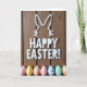 This design shows a tall, portrait-style scene set on warm brown wooden planks with visible grain and vertical lines. Near the top, a simple white line drawing of a long-eared bunny 🐇 sits lightly against the rustic background, giving the layout a gentle, friendly tone. Just below it, the words “HAPPY EASTER!” appear centered in large white all-caps letters, standing out clearly against the wood. A faint shadow under the letters makes the message look slightly raised, like it’s hovering above the surface. Along the bottom edge, a neat row of decorated egg shapes forms a border, arranged close together like they’re sharing space in a cozy lineup 🌷. The eggs are painted in soft pastel pink, sunny yellow, and mint green, and the patterns include blue-and-white stripes, orange swirls, and small polka dots that feel like little gestures exchanged between friends. The lighting is even and soft, bringing out the texture of the wood and the brushed paint details. The lower border shows multiple pastel eggs with mixed patterns lined up tightly across the full width of the card.