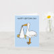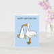 Uma simples ilustração de um gato guardado numa folha branca pendurada do bico de uma cegonha gigante. A imagem é colocada sobre um fundo de cor azul pálido e acompanhada das palavras 'Feliz Dia de Gotcha'.