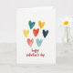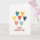 This valentine's day card has seven watercolor hearts all cuddled up together on a white background. Each heart is kind of see-through and has soft edges, giving them a dreamy look. The colors are so pretty - there's a bright red one in the middle, then some sunny yellows, calm blues, deep navy, and a soft coral. It's like a rainbow of love! The whole design feels super joyful and celebratory, with the soft light making the colors blend together like a beautiful painting. At the bottom, it says "happy valentine's day" in fancy red writing, adding a lovely touch to the airy design. The brushstroke aren't perfect, giving the hearts a handmade feel.