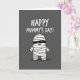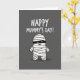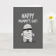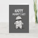 This card features a dark gray background with a cute, bandaged character centered in the scene, its rounded body wrapped in overlapping white strips that feel gently snug like a hug ❤️. A slim black band across the face reveals two bright crescent eyes and a small curved smile, giving it a sweet, friendly look as if it’s sharing a quiet joke with someone close. Soft shading on the white wraps adds a little depth, while the simple style keeps the focus on the character’s warm expression. Above the figure, the message “HAPPY MUMMY’S DAY!” sits near the top in thick, hand-drawn-style white lettering that stands out clearly against the dark backdrop. The spacing leaves plenty of breathing room so the words feel light and easy to read, not crowded. A faint shadow under the character helps it feel grounded, like it’s standing there waiting with a tiny gift 🌼. The overall palette stays mostly gray, white, and black, with the brightest highlights in the text and the character’s eyes. The white letters sit centered at the top, while the bandaged figure is centered below with a soft shadow directly beneath it.