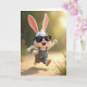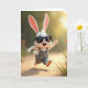 This card features an anthropomorphic white bunny 🐰 bounding along a sunlit path, its tall ears lined in pink and its smooth coat catching the warm light. Dark-lensed glasses sit on its face, and the wide, open-mouthed smile reads like it’s racing toward a friend with an eager, affectionate grin. It wears gray overalls dotted with small white spots, adding a cozy, youthful look as its arms stretch outward for an almost-hug in motion. The background is softly blurred with golden-hour glow, mixing gentle greens and shimmering light circles that feel like a quiet park or garden edge. A short greeting appears near the top in a soft pastel tone, with smaller supporting words placed beneath it in a lighter shade for contrast. The bunny’s lifted foot and forward-leaning posture suggest a carefree dash, like a sweet run to meet someone special 🌷. Behind it, the sandy ground fades into warm highlights while the green backdrop melts into bokeh specks and honey-colored haze.