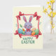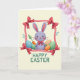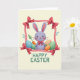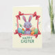 Designed with a friendly spring scene, this card features a lavender bunny with long upright ears, a gentle smile, rosy cheeks, and bright eyes that seem to linger fondly on the viewer 🐰. A small red bow tie at its neck mirrors the crimson accents scattered around the design, adding a sweet, affectionate touch. The bunny sits among pastel oval shapes like decorated eggs, each one patterned with soft stripes and dotted details that feel like little shared secrets between friends. Behind the ovals, an orange carrot and a few green sprigs peek out, hinting at a garden setting and a cozy, close-together moment. A stitched-look ribbon border frames the artwork, giving the edges a textured, crafted appearance without looking busy. In each corner, a glossy red bow adds contrast against the creamy background, drawing the eye around the frame like a gentle embrace 🌷. Centered below the illustration, the greeting text is set in leafy green letters, standing out clearly against the light space beneath the scene. The bottom area remains open and creamy, with the green message sitting neatly under the bunny and pastel ovals.
