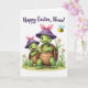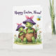 Designed with two green-skinned reptile characters with segmented brown shells, this illustration shows them in matching purple wide-brimmed hats topped with soft pink bows. A larger figure stands slightly behind the smaller one, leaning in with a caring posture that reads like close friendship or a gentle family bond. Their wide smiles and rosy cheeks face forward, and the smaller character’s upward glance adds a sweet, affectionate connection. They stand on a light green patch of grass sprinkled with tiny white flowers with yellow centers, giving the scene a springtime feel 🌷. In the upper right, a small striped winged insect hovers, adding a touch of motion without crowding the space. Above the characters, a seasonal greeting appears in purple lettering, centered near the top against the white background. The smooth shading highlights the rounded faces, the shell segments, and the soft folds of each pink bow 🐰. The white backdrop keeps the purple hats and yellow flower centers especially noticeable.