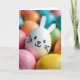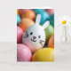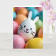 This design shows a close-up cluster of decorated egg shapes, with one smooth white egg in front like the focus of a friendly little scene 🐰. On its face are two tiny black dot eyes, a small pink triangle nose, a curved black smile, and fine whisker lines that make it look like it’s quietly grinning at its neighbors. Two white cut-out ear shapes sit at the top, giving it a bunny-like look that feels affectionate, as if it’s leaning in for a photo with friends 🐇. Around it, pastel eggs in pink, blue, green, yellow, and orange crowd together, their closeness suggesting a cozy, companionable gathering. The background eggs fade softly out of focus, so the front egg’s expression stays sharp and inviting. A short Easter greeting sits near the top in a light, spring-toned color, with smaller words tucked beneath it in a darker shade for contrast. In the lower left, a bright pink egg has a sugary, grainy coating that catches the light beside the glossy shells.