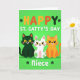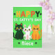This greeting card sets a funny St. Patrick’s Day scene with “St. Catty’s Day” energy on a bright neon-green background 💚. Across the top, “HAPPY ST. CATTY’S DAY” stretches in large letters shaded from orange to red with black accents, with small four-leaf clovers tucked between words ☘️. Center stage, three cartoon cats stand shoulder to shoulder like close friends posing for a photo. On the left, a sleek black cat stares forward with sharp yellow eyes and a little pink tongue out, giving a flirty, teasing look. In the middle, a white cat with green spots and rosy cheeks looks wide-eyed and sweet, leaning into the group with an easy, affectionate closeness. On the right, an orange tabby with light stripes matches the tongue-out grin, completing the trio’s shared, buddy-like rhythm. Near the bottom, the word “niece” sits in small white letters, flanked by shamrocks, while the cats’ whiskers and simple outlines pop against the flat green field.