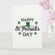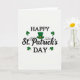 This card features a St. Patrick’s Day layout on a bright white background, with “HAPPY” at the top and “DAY” at the bottom in dark black lettering. Centered between them, “St. Patrick’s” appears in a smooth, flowing black style that feels like it’s gently wrapping the phrase in a friendly embrace. An emerald green leprechaun hat with a shiny gold buckle sits near the middle of the wording, like a cheerful little centerpiece everyone gathers around 💚. Four green shamrocks are placed around the main message, two on each side, creating a neat, balanced frame that feels like a pair of friends standing close for a photo ☘️. Small curling flourishes decorate the space around “St. Patrick’s,” adding motion and a light, airy touch without crowding the design. The contrast of black text against the white background makes the greens look richer, from the hat to the clovers. The hat’s curved brim and bright buckle stand out sharply against the surrounding black letters and the open white space.