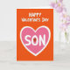 This card shows a bright orange background with a large pink heart in the middle, outlined in white. Across the top, the text “HAPPY VALENTINE’S DAY” is written in white, with a casual hand-drawn look, and it sits above the heart. Inside the heart, the word “SON” appears in white, centered and easy to read. The “O” is replaced by a small dark red heart, which adds a sweet little detail ❤️. The simple shapes and strong colors make the message feel direct and sincere, without needing extra decoration. It feels meaningful to give because it clearly says “I love you” in a way that’s warm and straightforward, especially for a son. Share it to send a little extra care and closeness on Valentine’s Day 🥰.