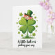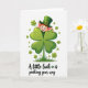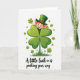 Designed with a bright white background, the card shows a cheerful leprechaun peeking from behind an oversized four-leaf clover, as if he’s sharing a secret with a close friend 💚. His wide grin, rosy cheeks, bright blue eyes, and orange hair sit under an emerald top hat with a shiny gold buckle, giving him a friendly, welcoming look. The giant clover takes center stage, with four heart-shaped leaves shaded from light lime to deep green, creating a soft, cushioned feel. Around it, smaller shamrocks float across the space like gentle confetti, adding a light sense of motion ☘️. A small patch of green grass at the base helps the clover and leprechaun feel grounded, like they’ve just popped up for a quick hello. Beneath the illustration, the phrase “A little luck is peeking your way” appears centered in dark green lettering, with a tiny shamrock used as a decorative star-like mark. The leprechaun’s sideways peek and the clover’s heart-like leaves together suggest a warm, friendly closeness without needing any extra fuss. The final detail is the tiny shamrock accent tucked into the text line below the scene.