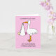 Um desenho de uma cegonha gigante segurando um bebê em um lençol branco que pende do bico da cegonha. As palavras 'Congatulations on your hebrew naming ceremony' acompanham a imagem.