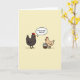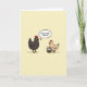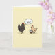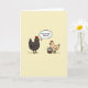 This card shows two human-like birds facing each other on a soft cream-yellow background, set like a quiet farmyard moment with just a hint of shadow under their feet. On the left, a sturdy dark-feathered bird stands a little closer, its bright red comb and wattle drawing your eye as it leans in as if sharing a teasing secret. A speech bubble near its beak holds the line “TIME TO HIDE THE KIDS” in dark lettering that stands out clearly. On the right, a lighter tan bird with matching red facial features tilts its head toward the other, giving a tender, slightly nervous look that reads like close partnership and trust. Nestled beside this lighter bird is a small woven basket filled with smooth white eggs, tying the joke to a cozy, protective scene 🐰. The simple outlines and flat areas of color keep everything easy to read, while the warm yellow and red accents add a gentle spring feel 🌷. The basket sits low at the right side with several white ovals visible against the pale ground.