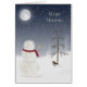Homem de neve com estrela dourada para pinheiros sob a lua de cheio.
